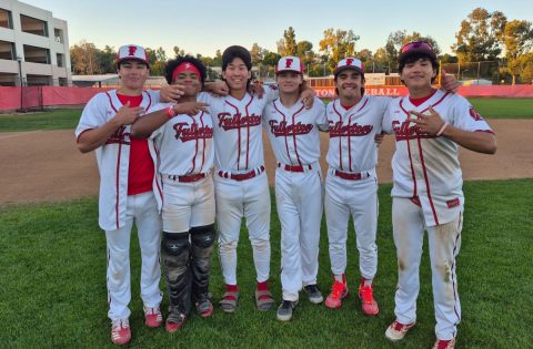 Fullerton players (from left) Gavin Talavera, Calin Williams, Caleb Brown, Garrett Wightman, Caden Wise...