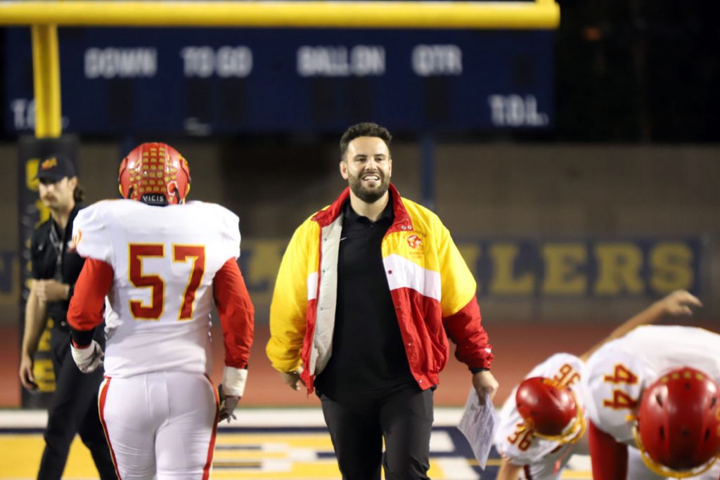 Coach Connor McBride guides the Warriors before Friday’s CIF Division 13 final vs. Montebello. (PHOTO: Fernando M. Donado, For OC Sports Zone).