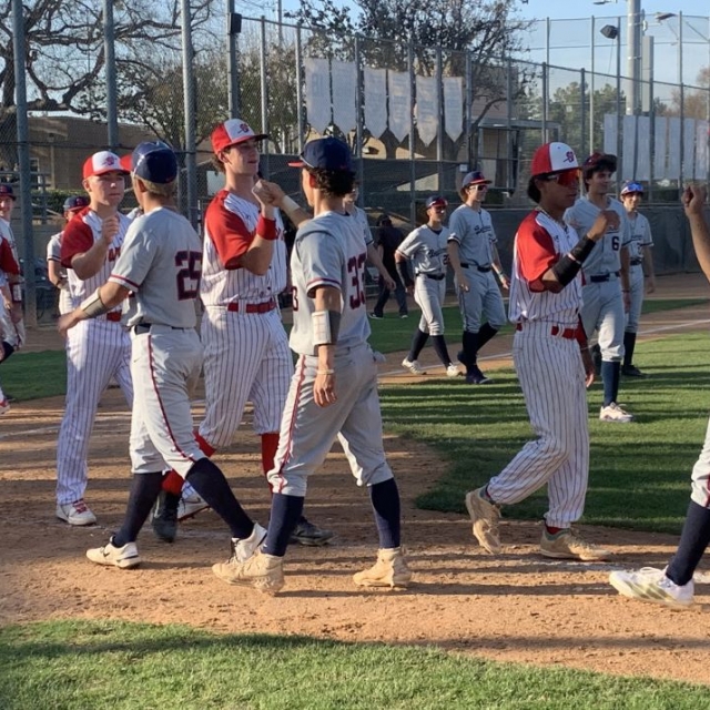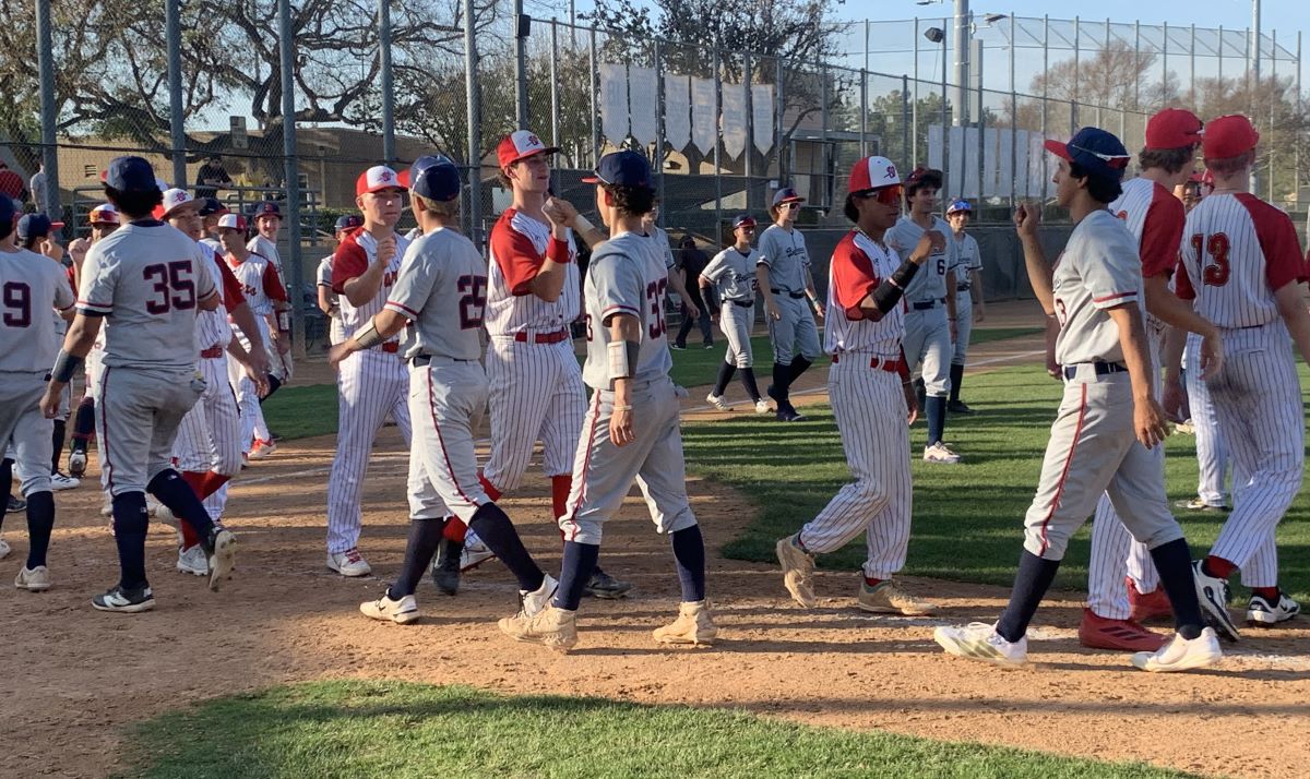 Beckman Patriots congratulate winning pitcher Vinnie Montes after Monday’s victory over Woodbridge. (PHOTOS: Tim Burt, OC Sports Zone).