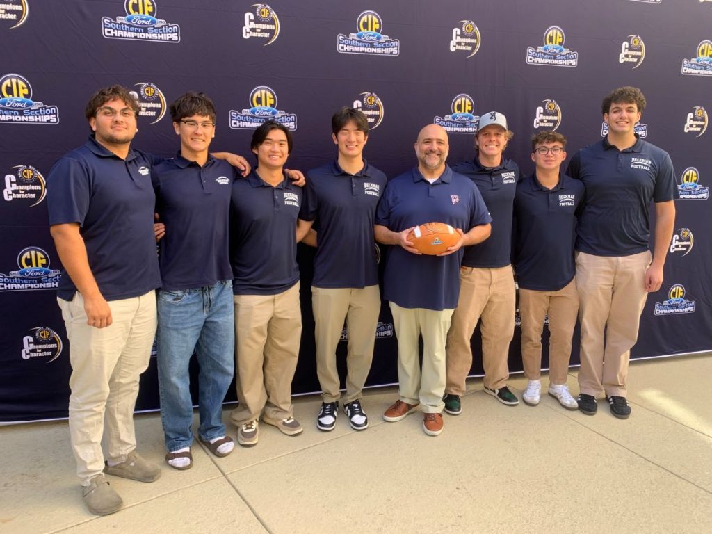 Beckman Coach Marcello Giuliano with some of his standout players (from left) Rian Silva, Sawyer Nickelson, Aidan Tran, Noah Nam, Makhi Czaykowski, Nathan Garcia and Roy Chaya at the CIF press conference Tuesday at The Grand in Long Beach. (PHOTO: Tim Burt, OC Sports Zone).