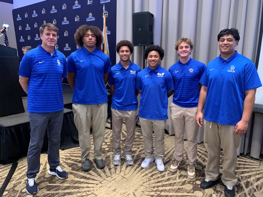 Santa Margarita Coach Carson Palmer with his captains (from left) Simote Katoanga, Trent Mosley, Dash Fifita, Trace Johnson and Niniva Nicholson at Tuesday’s CIF press conference at The Grand. (PHOTO: Tim Burt, OC Sports Zone).