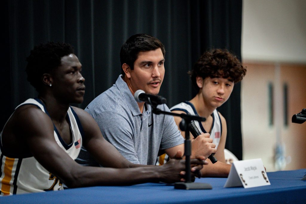 Crean Lutheran Coach Austin Loeb addresses the media as Jacob Majok (left) and Hunter Caplan listen. (Photos courtesy Crean Lutheran Shutterbugs, Samantha Burgett).