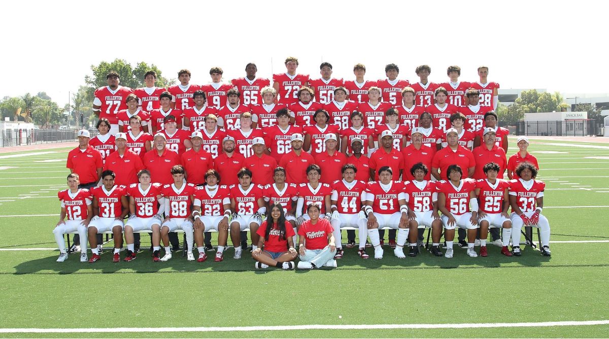 Fullerton’s football team with Coach Pete Karavedas. (Photos courtesy Fullerton athletics).