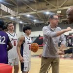 Orange Head Coach Robert Pedroza celebrates with his players after the Panthers defeated Santa...