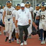 Coach John Halgan (with No. 23 Tyrell Flojo) asks about an official’s call Tuesday....