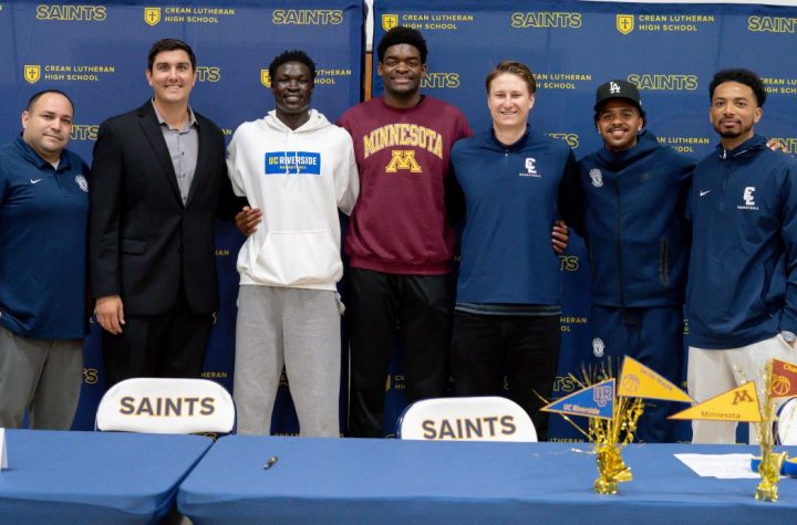 Santa Ana players celebrate Wednesday’s league win over Westminster. (PHOTOS: Tim Burt, OC Sports...