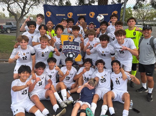 Portola players, including Brandon Yue (No. 12 ) and Kaveh Wojtowich celebrate the school’s...