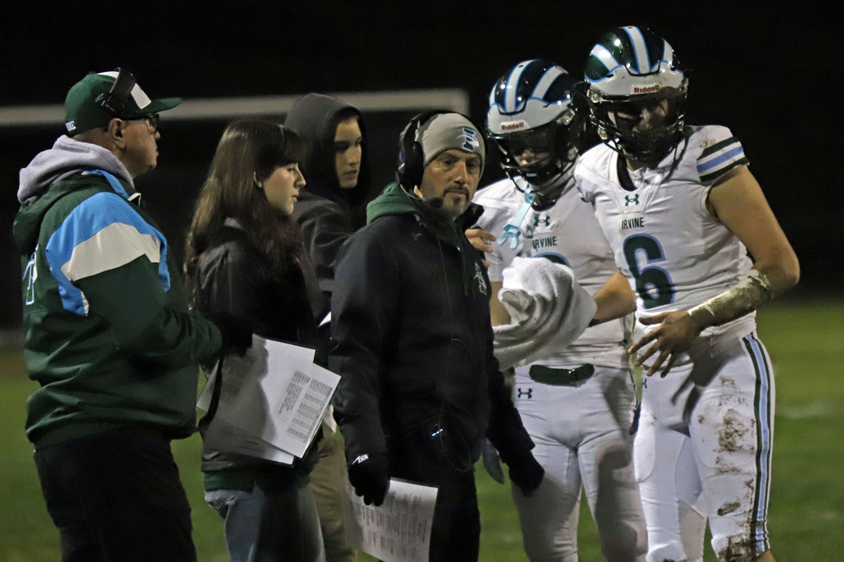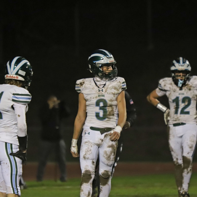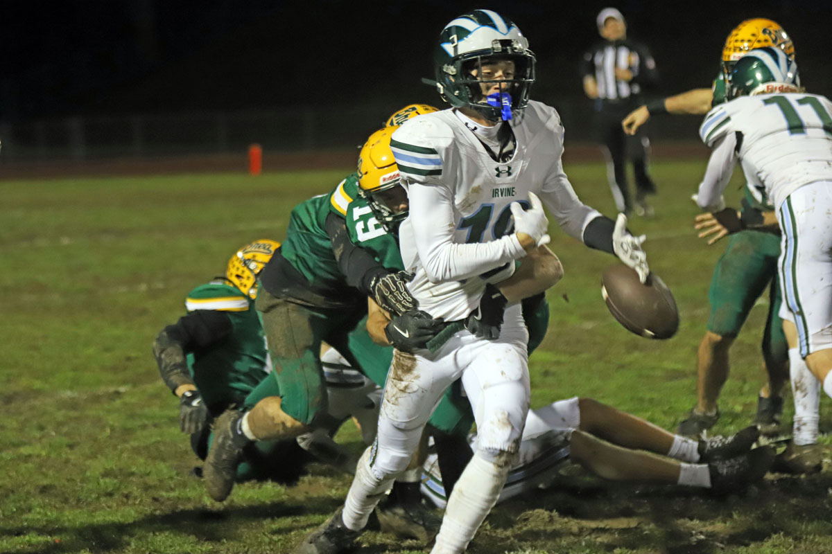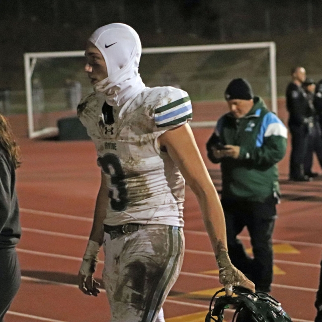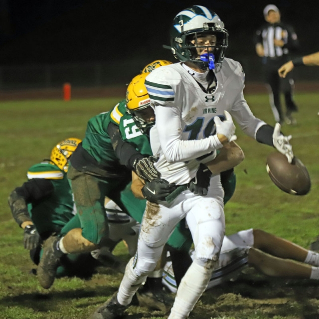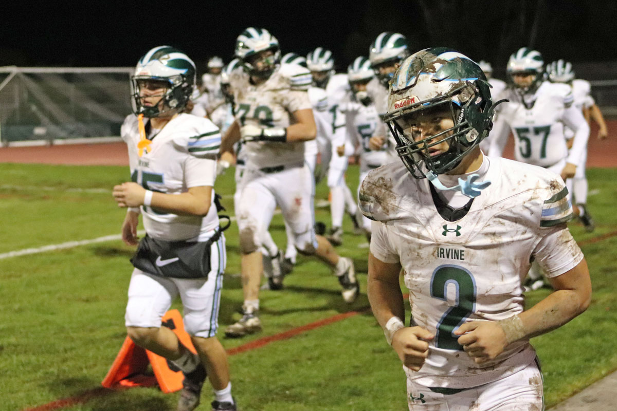 On the Vaqueros next possession, Irvine committed its second turnover that proved costly. Saferrzadeh pitched the ball to Jayden Heo, however Heo slipped into the deep mud and the ball hit off his helmet and was nearly caught in midair by Chris Bradish who pounced on the loose ball at the Vaqueros’ 36-yard line.