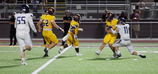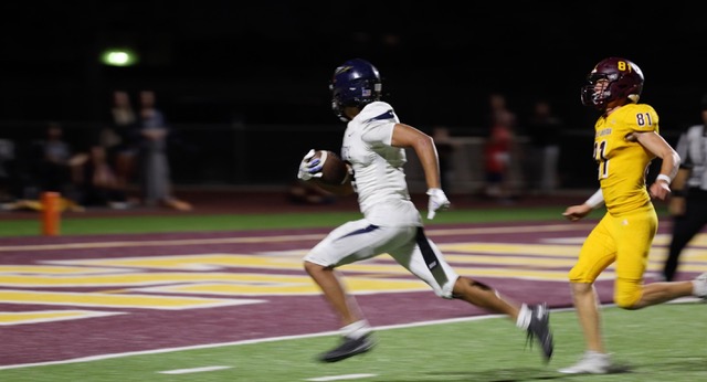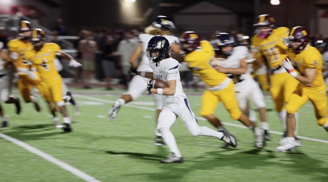 Calvary Chapel’s Eli Sutherland eludes a tackle in the first quarter Friday. (Photos courtesy Aidan Russell, Russell Bros Productions).