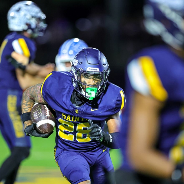 Crean Lutheran’s Caleb Bey breaks away for a touchdown Friday night. (Photos courtesy Crean Lutheran Shutterbugs, John Luciano).
