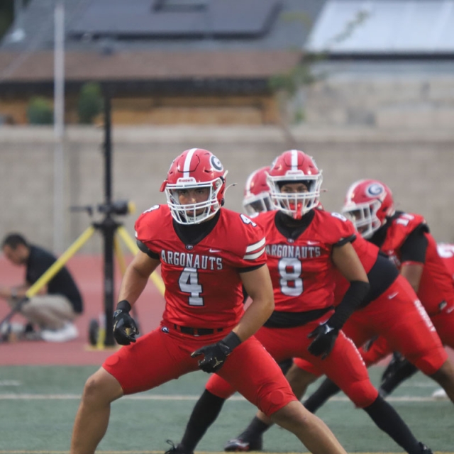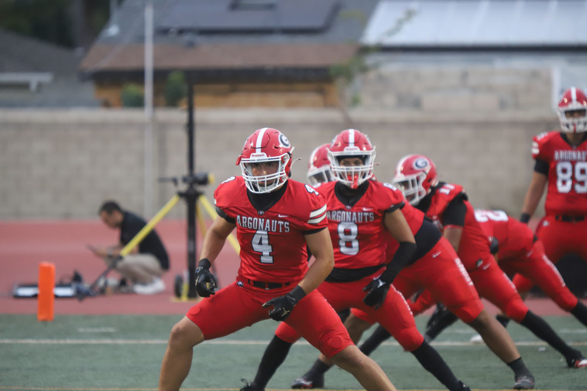 Garden Grove middle linebacker Jayden Menier (No. 2) and teammates prepare.