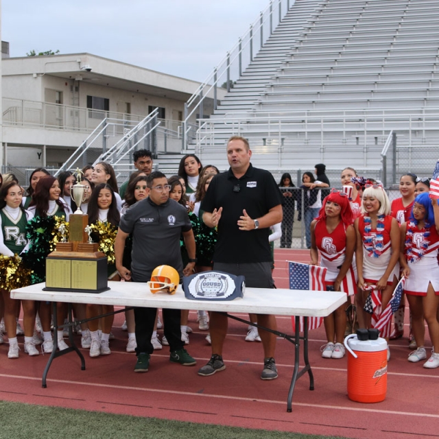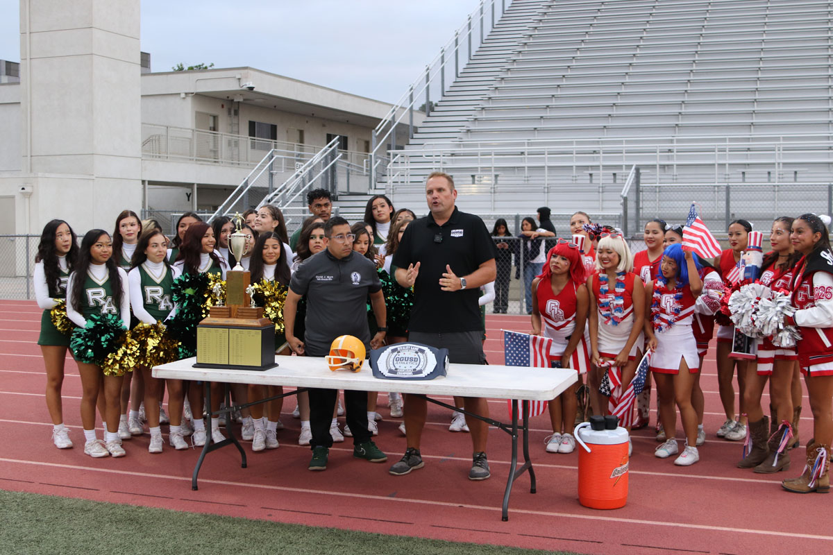 David Mamelli, Garden Grove Unified School District athletic director, talks about the Jack Jordan Memorial Trophy handed out to the winner of the Garden Grove vs. Rancho Alamitos game.