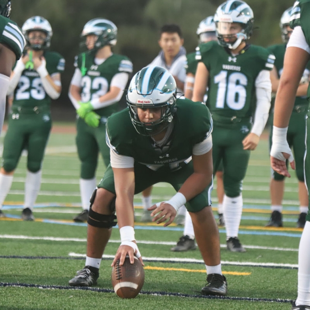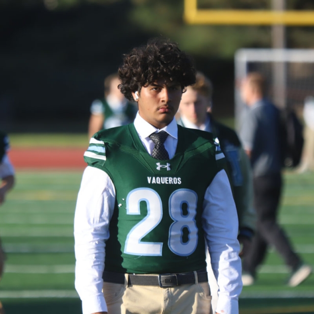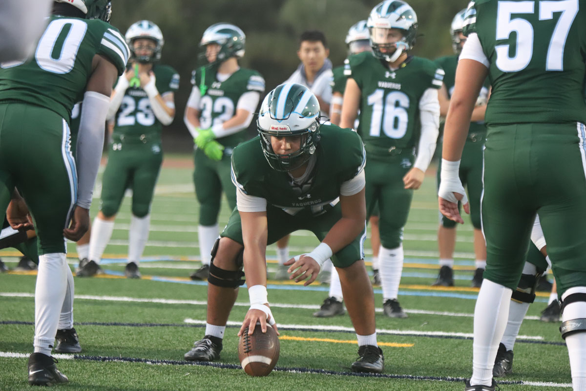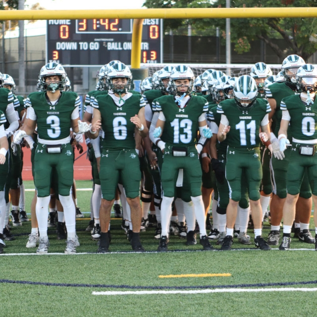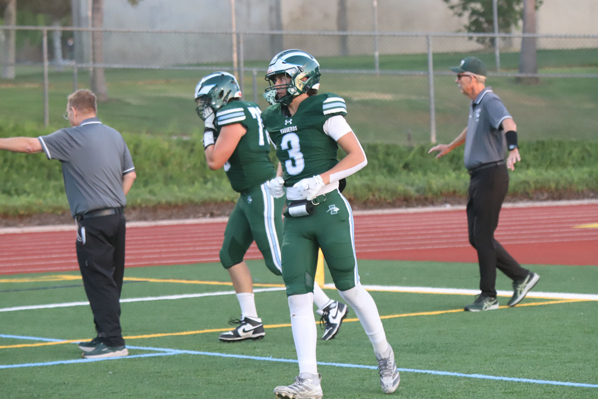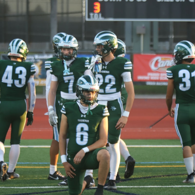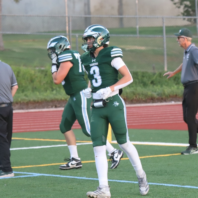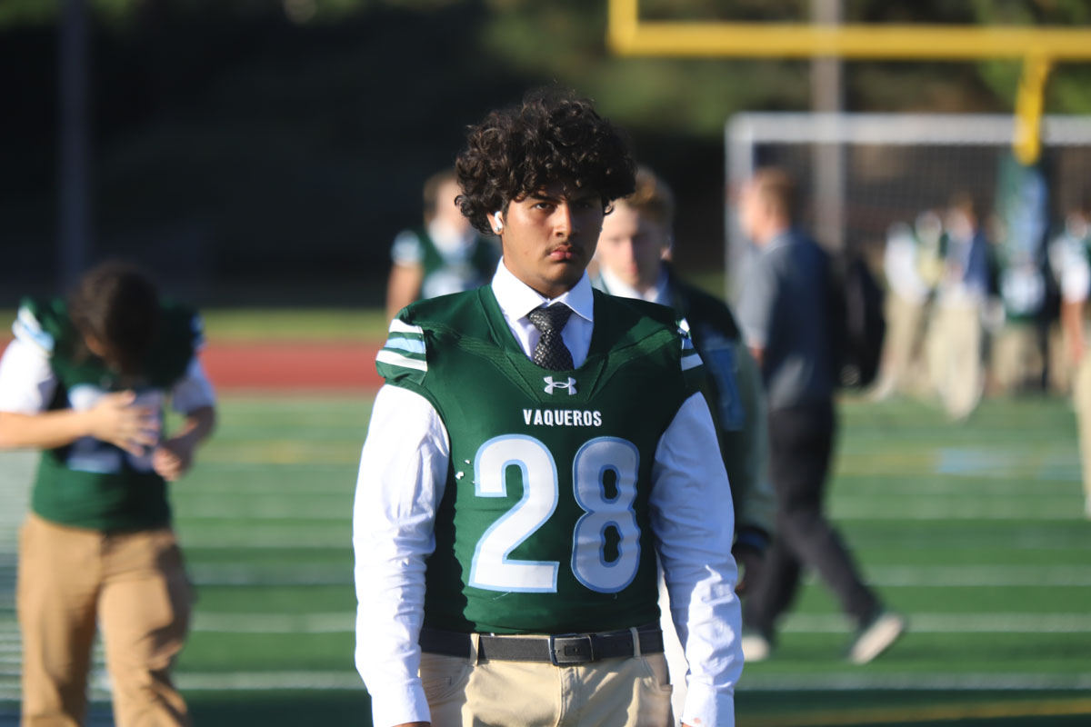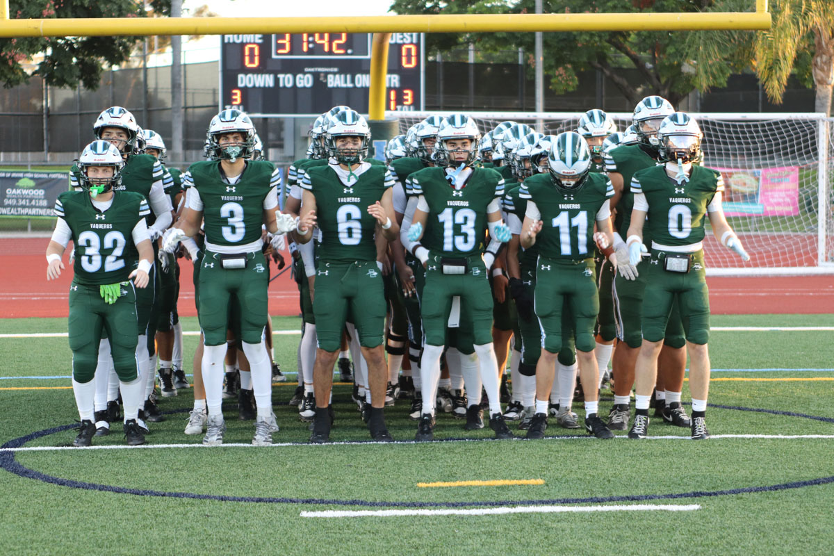 Irvine Coach Tom Ricci leads the Vaqueros on to the field for pregame warmups before Friday’s Iota League opener against Santa Ana. (PHOTOS: Fernando M. Donado, For OC Sports Zone).