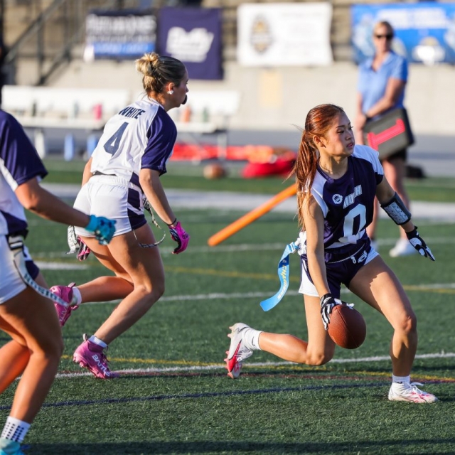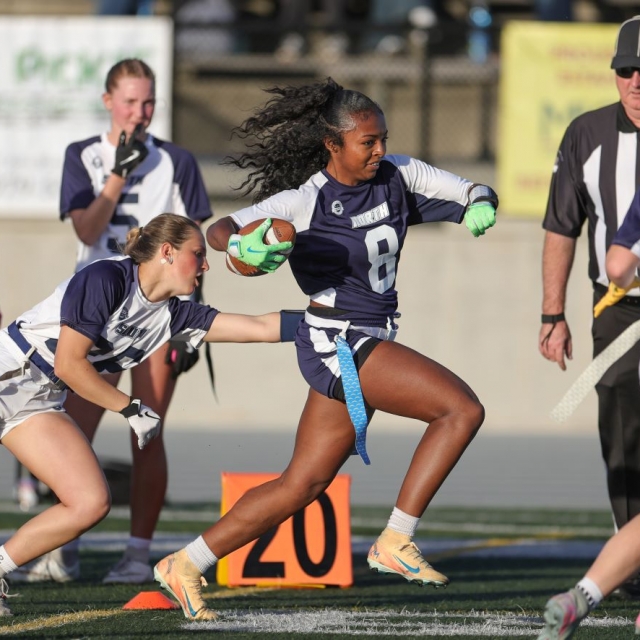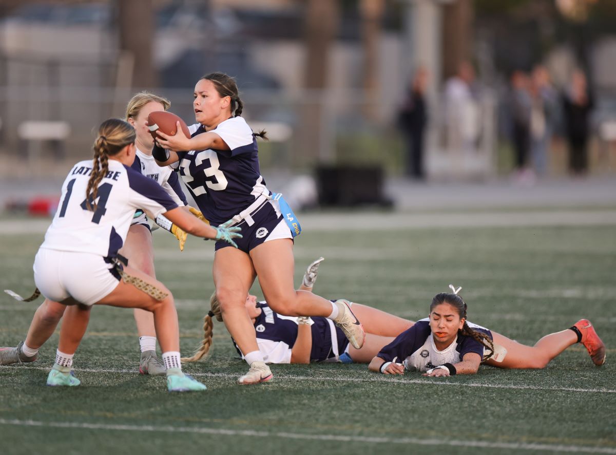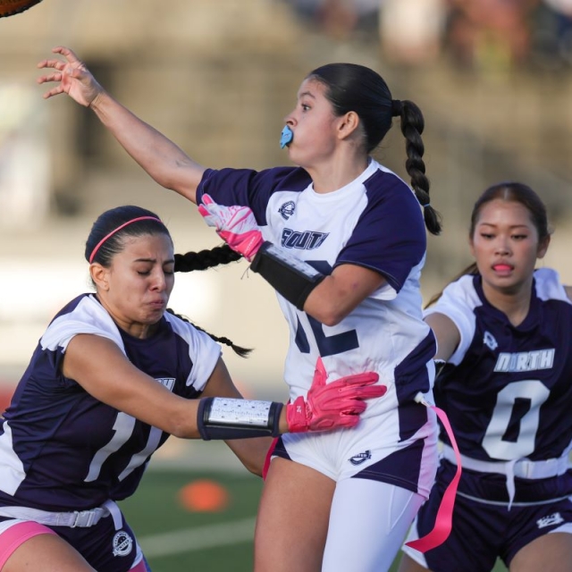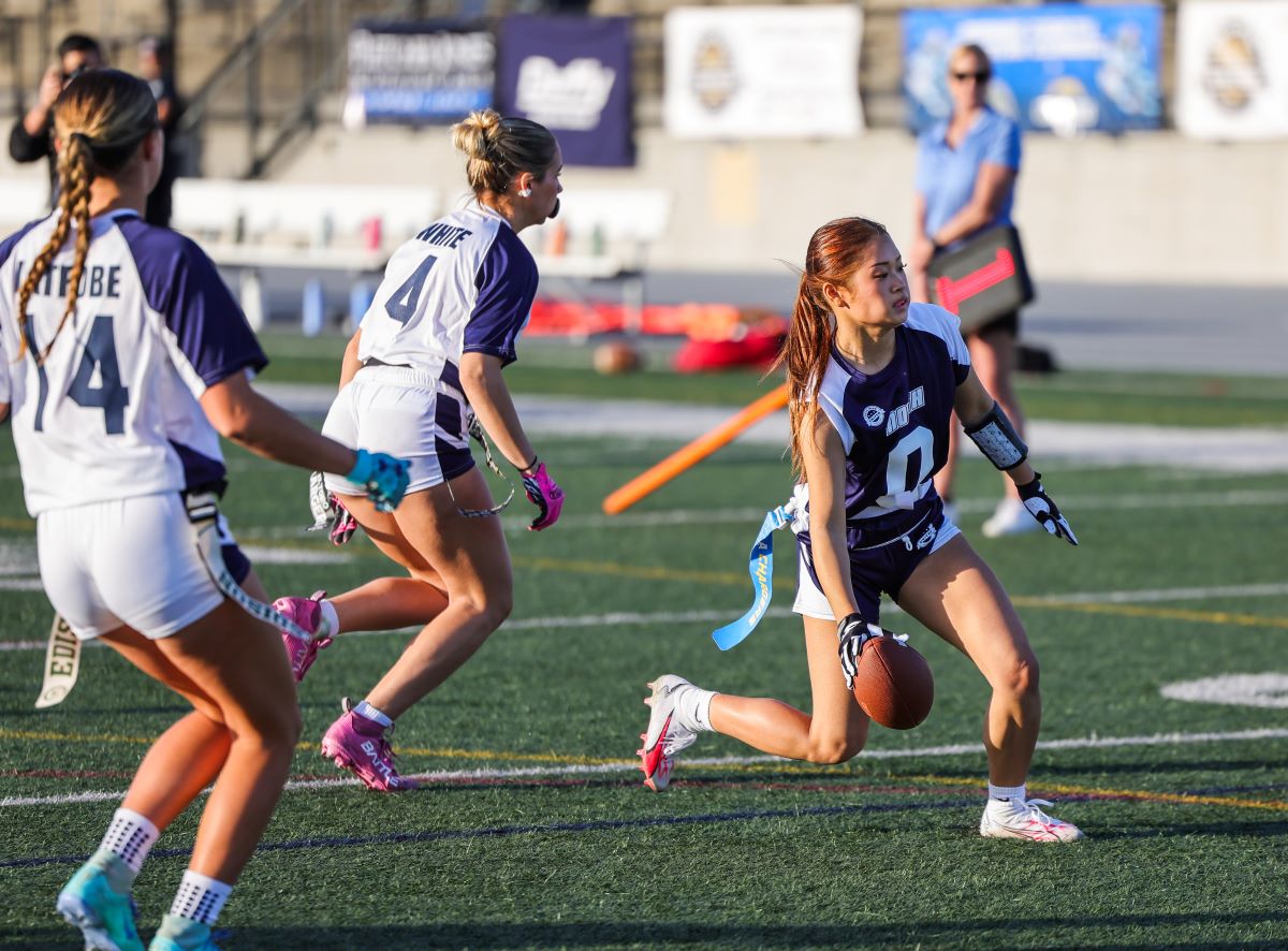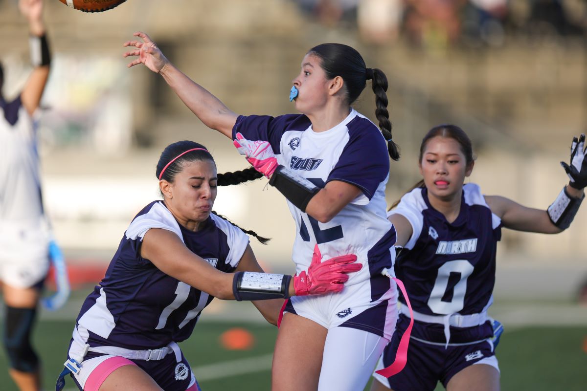 South quarterback Delilah Meza (Marina) narrowly evades a flag pull by North defender Kate Ross (Marina).