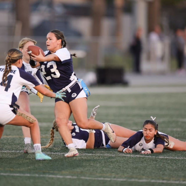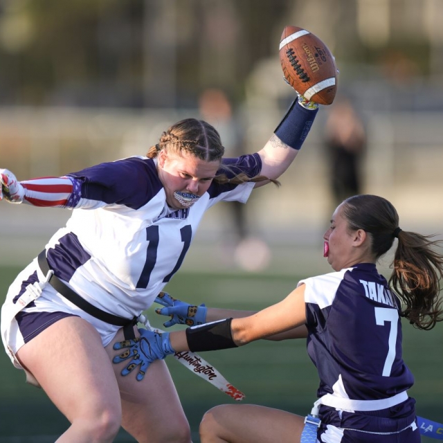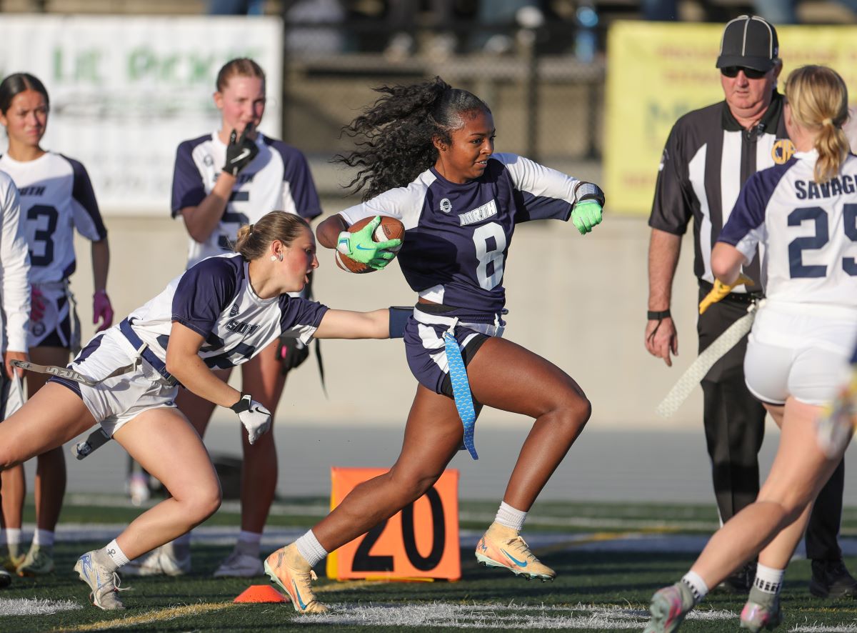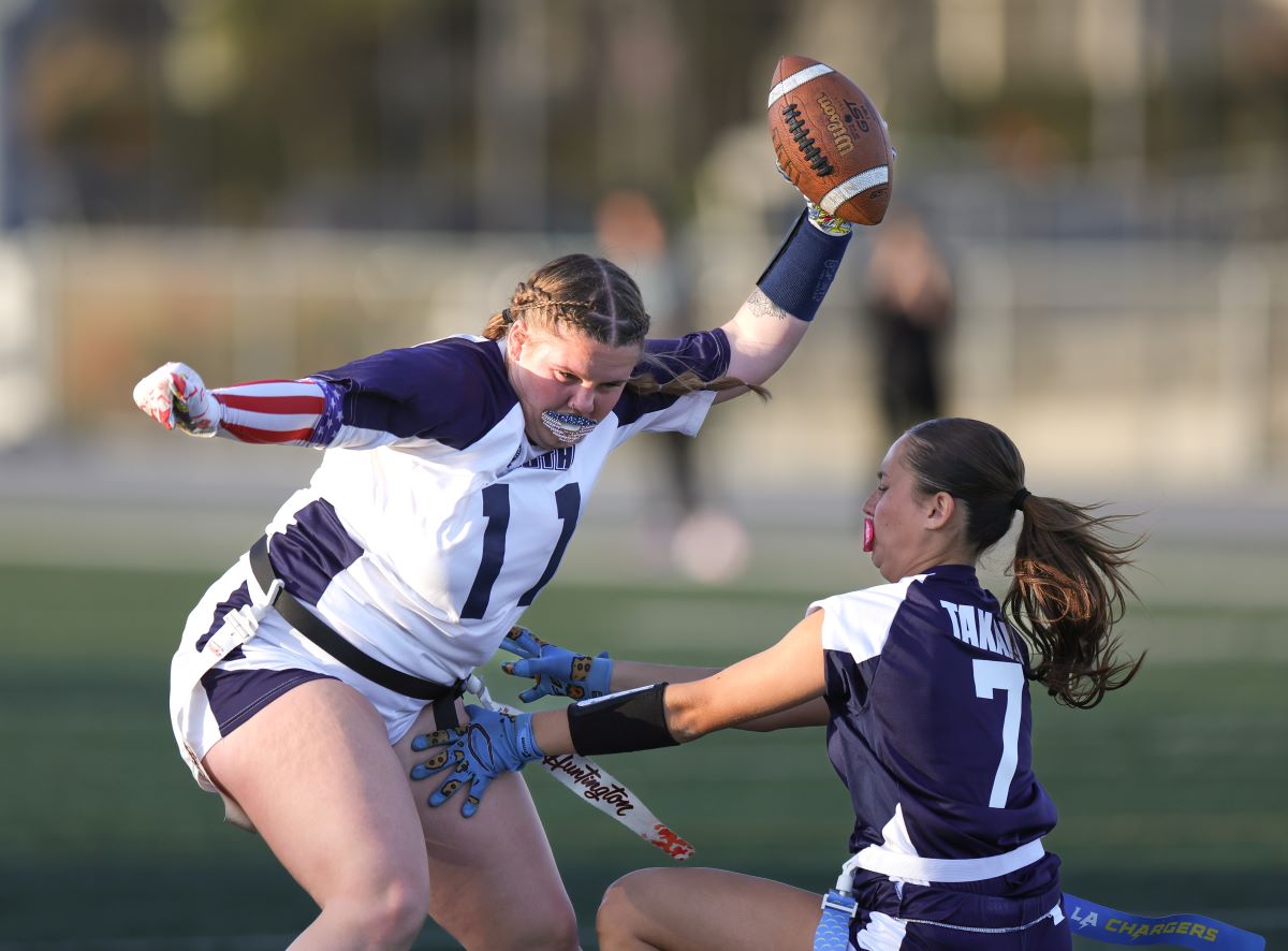 North's Ashley Guzman (Anaheim) gains yards as South's Ella Woods (Newport Harbor) reaches for her flag.