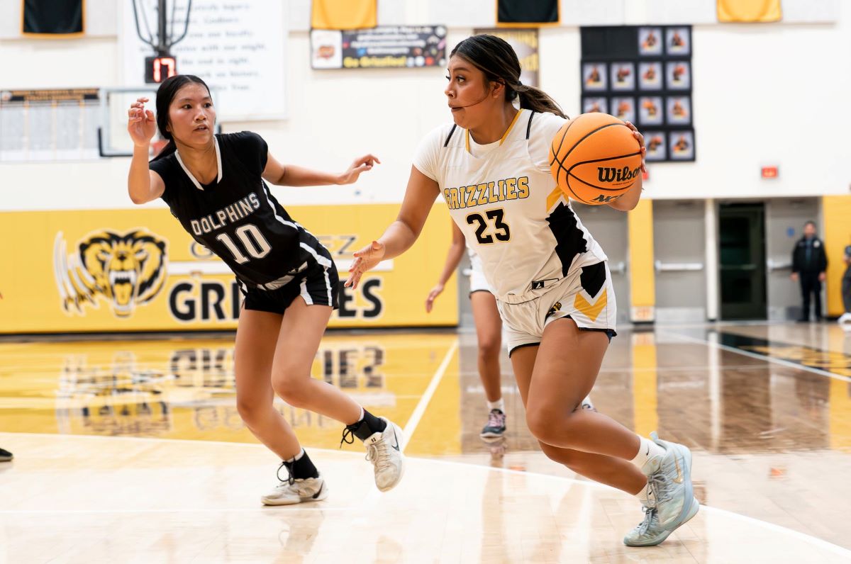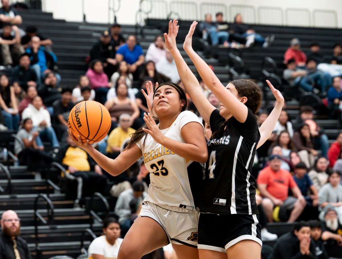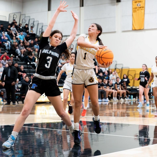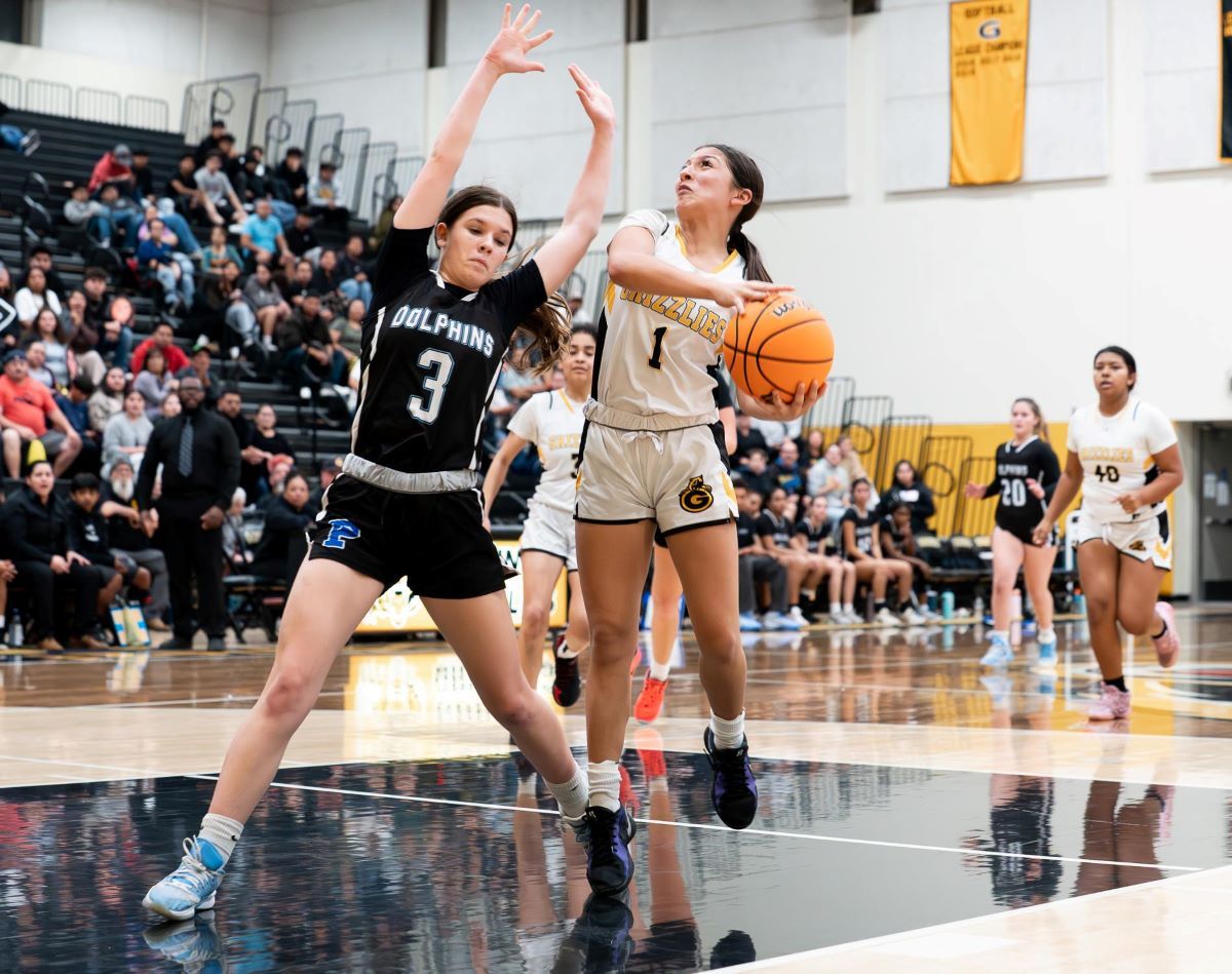Valerie Esteban from Godinez drives to the basket as Ayla Teegardin of Palisades defends Tuesday night. (Photos courtesy Mark Bausman, For OC Sports Zone).