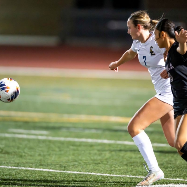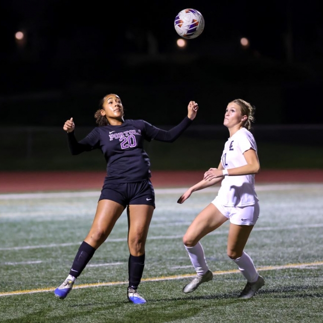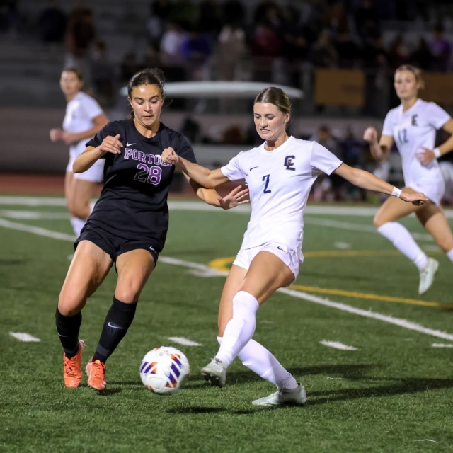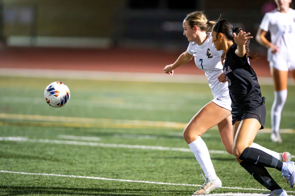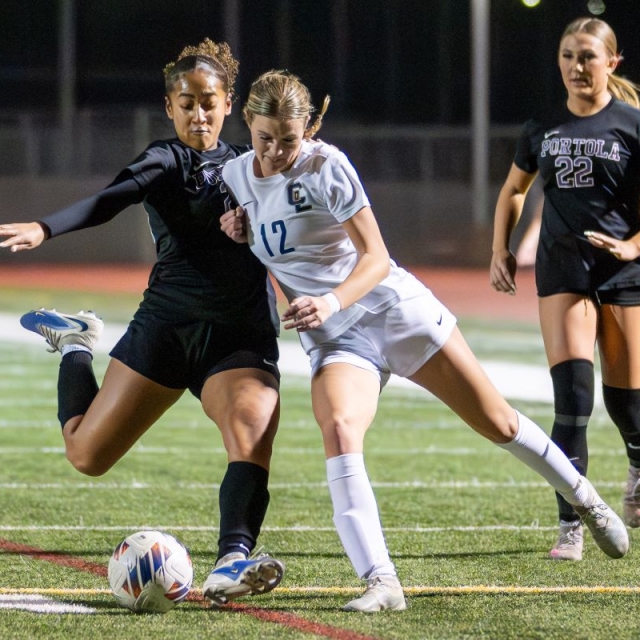 Portola’s Taylor Strickland and Crean Lutheran’s Allyson Hamiprodjo battle for the ball. (Photos courtesy Crean Lutheran Shutterbugs, John Luciano, Ted Rigoni and Howard Lyon).