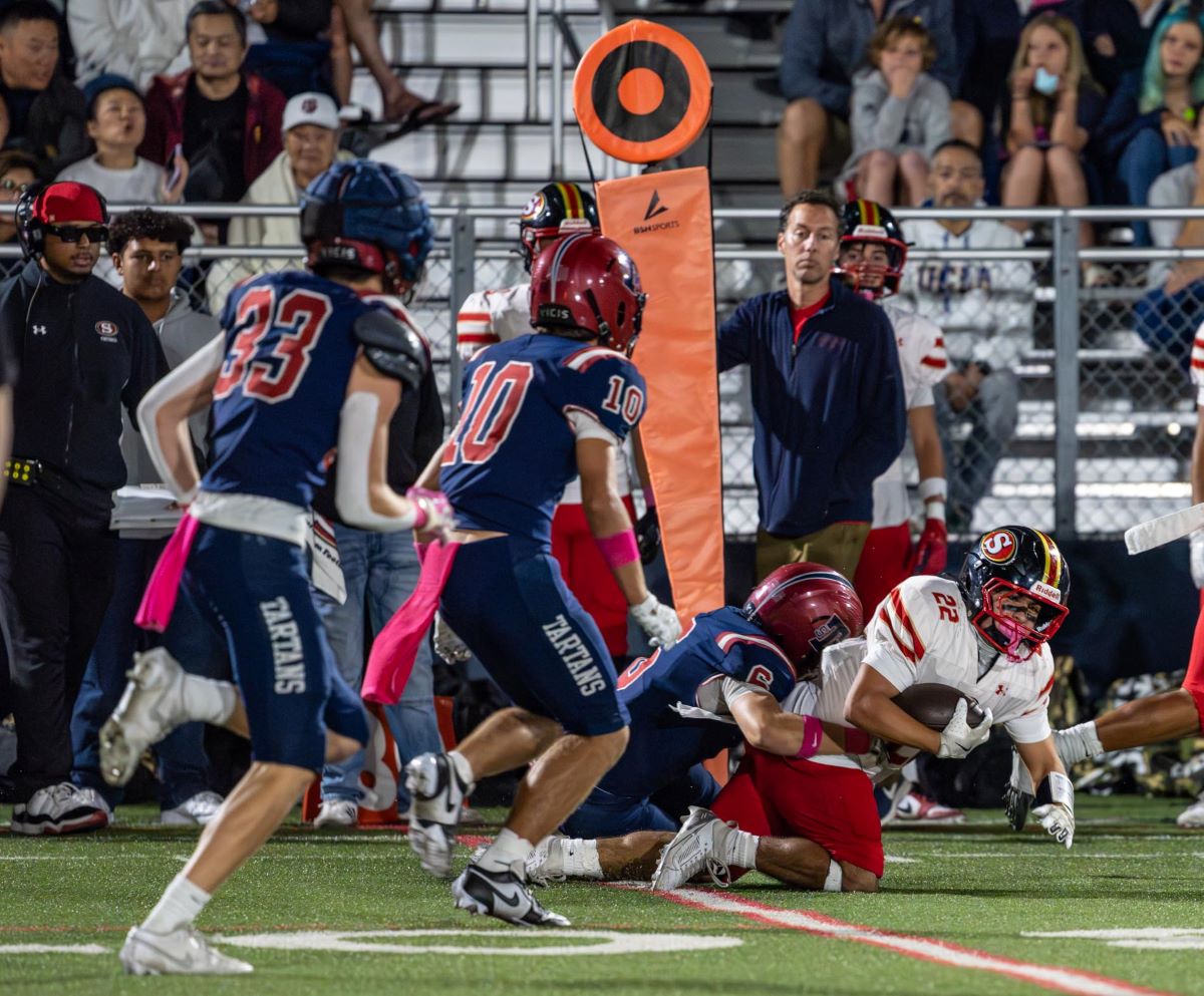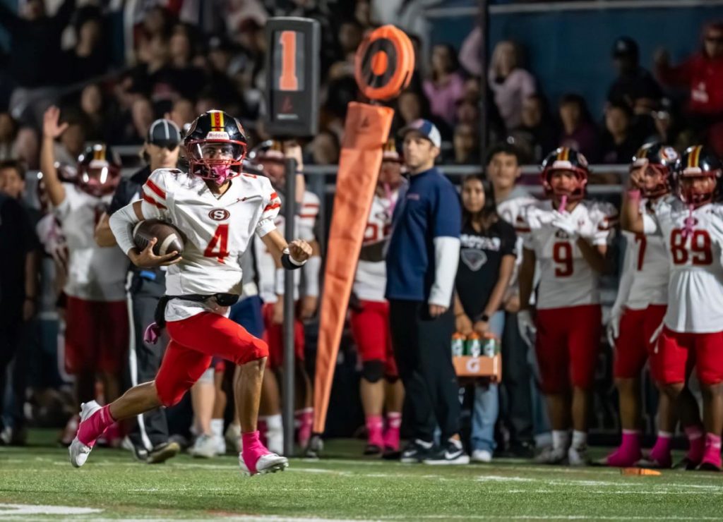 Segerstrom’s Noah Martinez with a quarterback keeper sprints into the end zone for a touchdown. (Photos courtesy Mark Bausman, For OC Sports Zone).