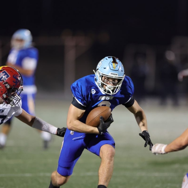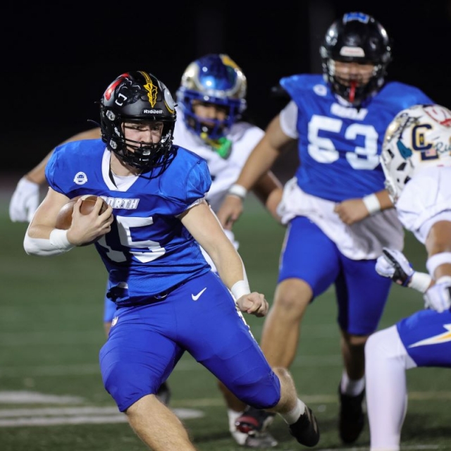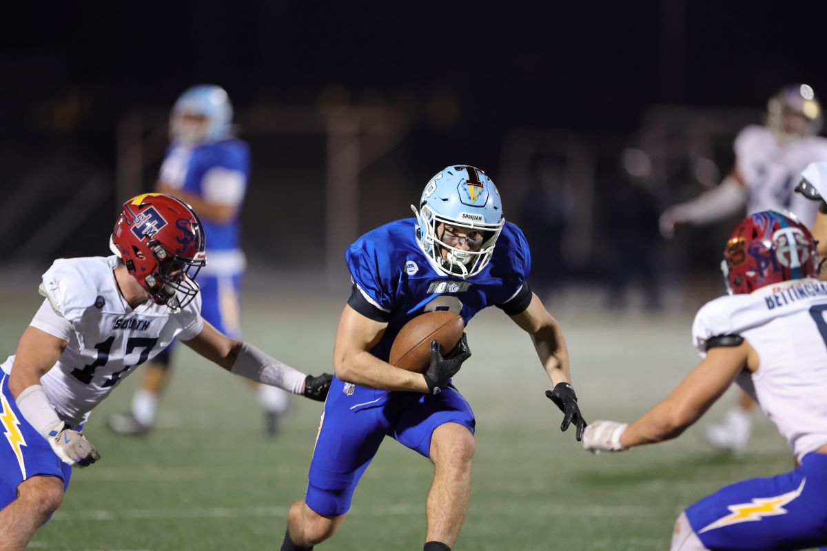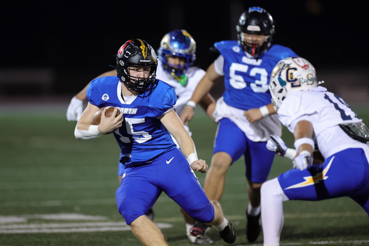 North's Ethan Mundt (Troy) carries the ball as South's s Joshua Kerst (San Clemente) pursues.