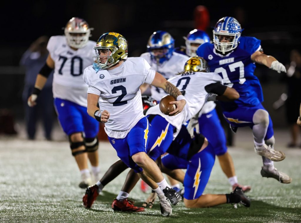 South quarterback Timmy Herr (San Juan Hills) evades defenders during Saturday’s annual OC all-star football game. (Photos courtesy John Luciano, For OC Sports Zone).