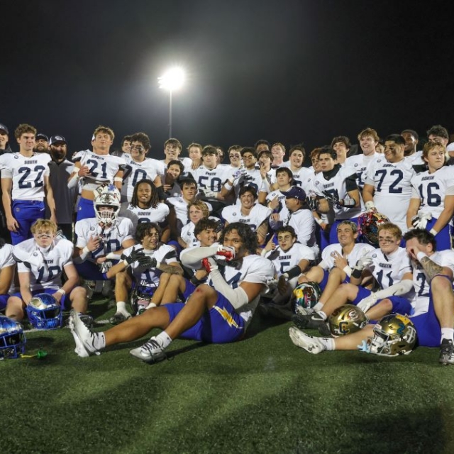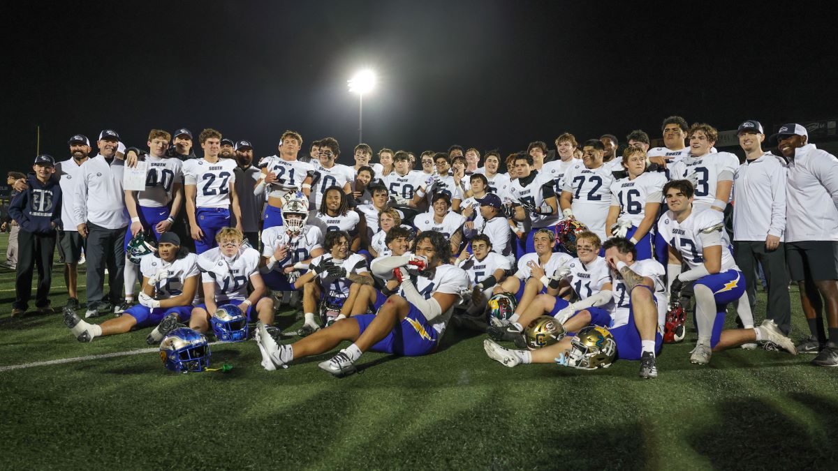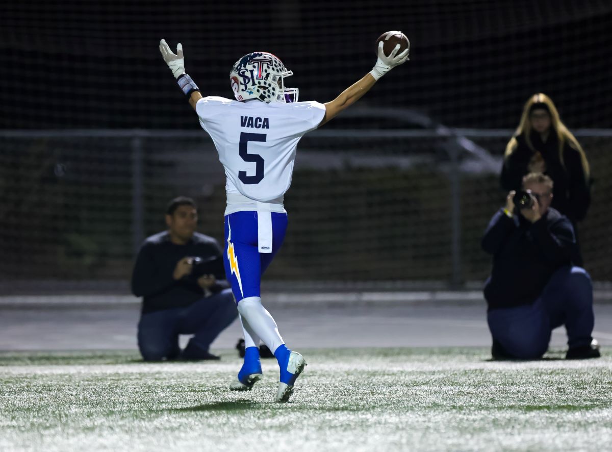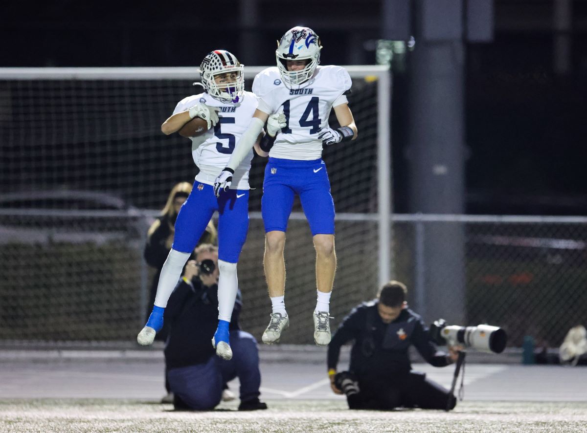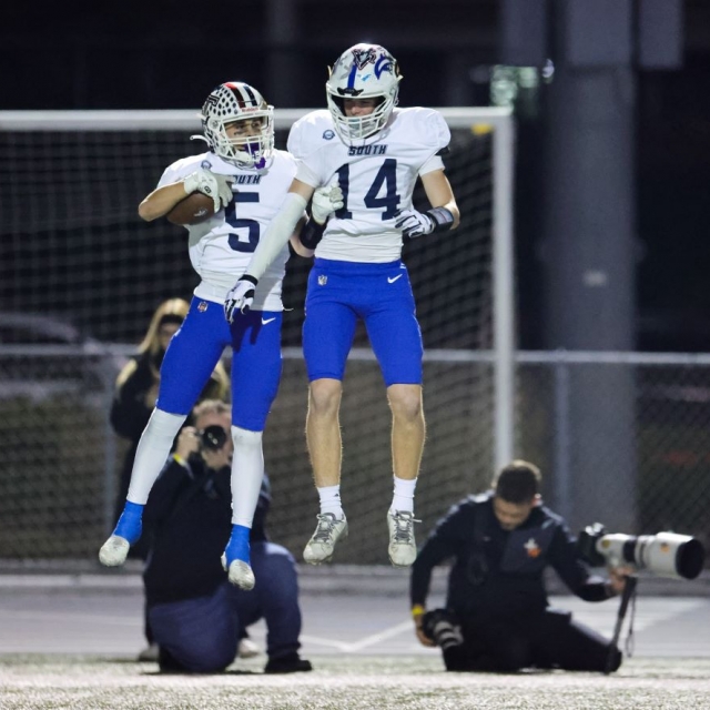 South's Braiden Valentino Vaca (Tesoro) and James Leicester (Dana Hills) celebrate in the end zone.