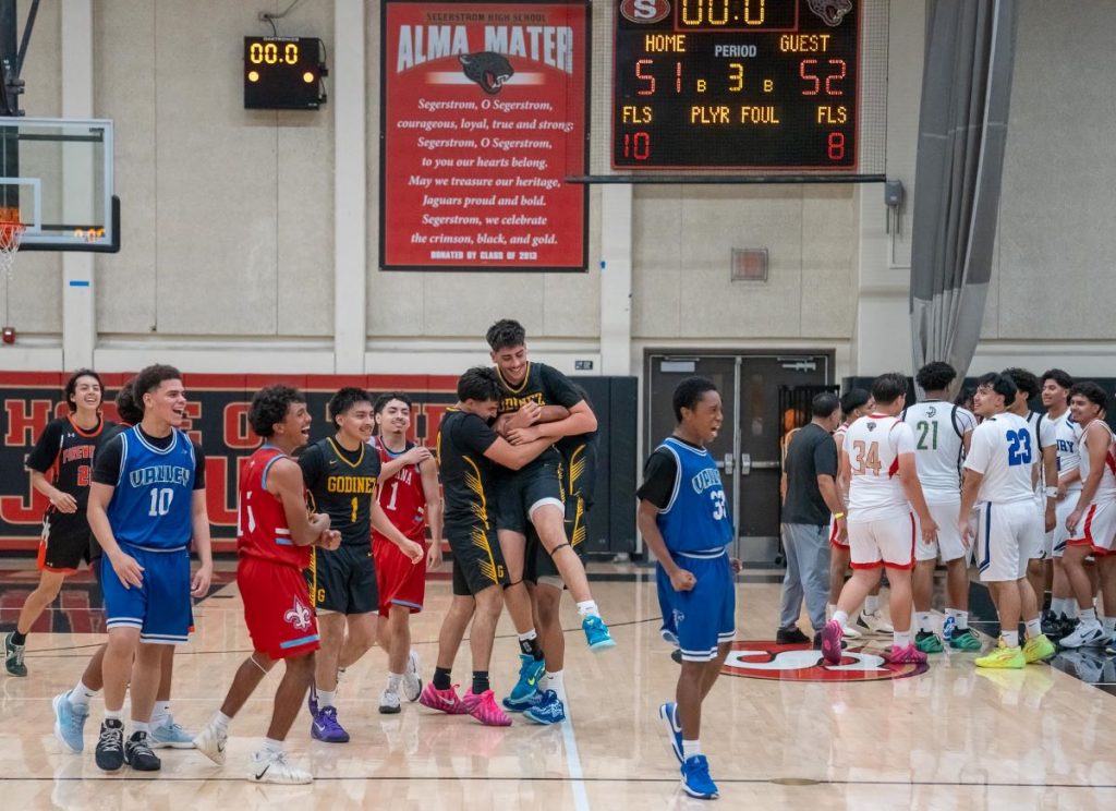 Jaiden Torres of Godinez is mobbed by teammates after sinking the winning 3-pointer in overtime Friday night. (Photos courtesy Mark Bausman, For OC Sports Zone).