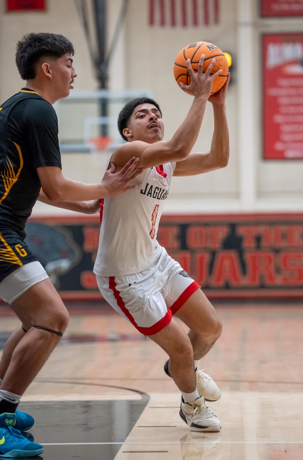 The Home team held a 21-20 halftime lead and extended the margin to six points early in the second 20-minute half. The Away team rallied to tie the game in the second half but the Home team took a 44-42 lead in the final 30 seconds when Gutierrez made one of two free throws.
