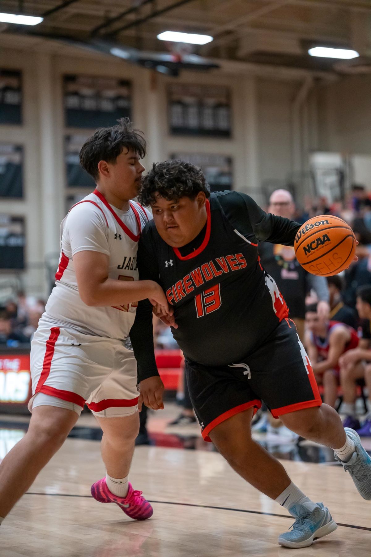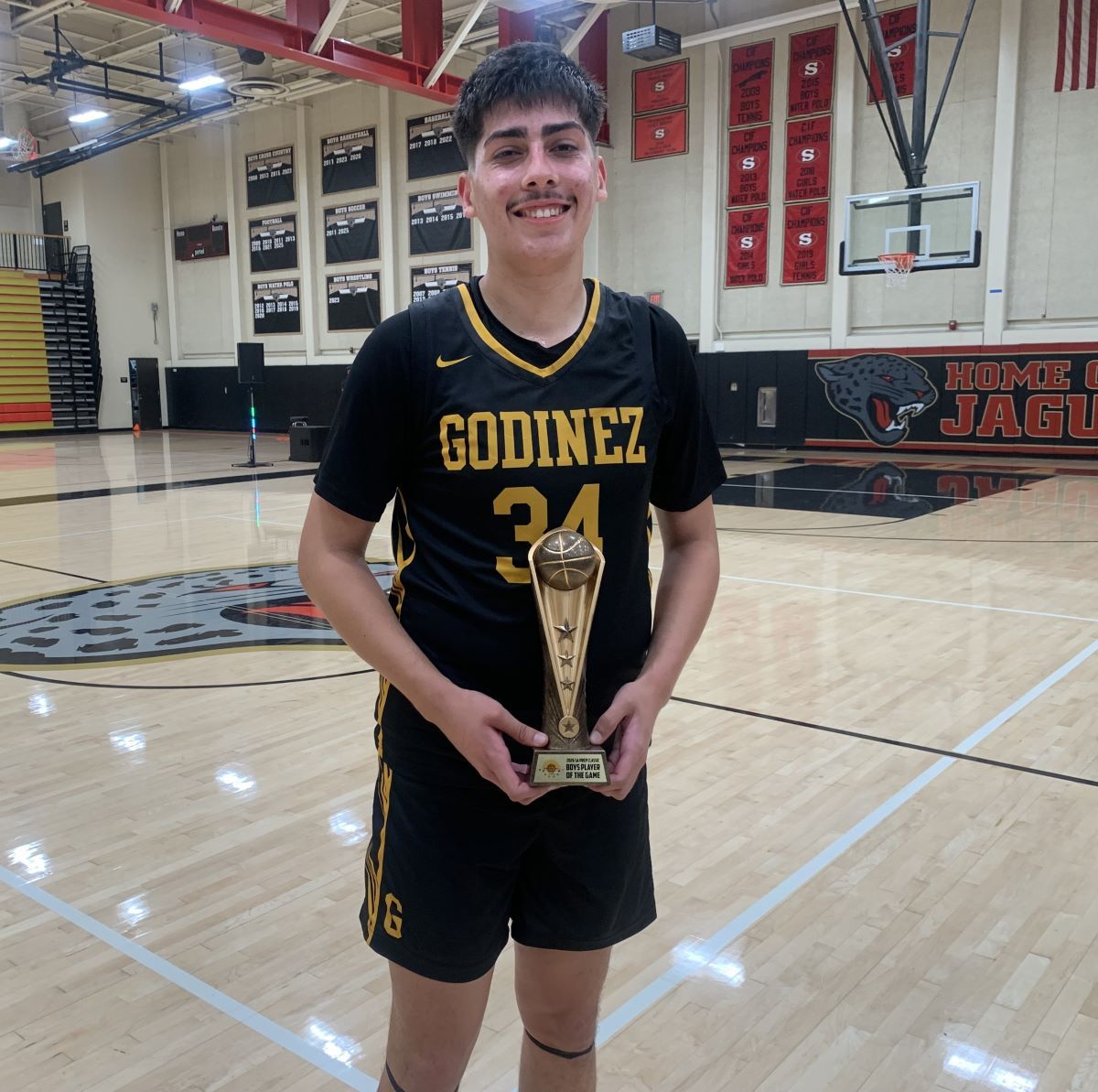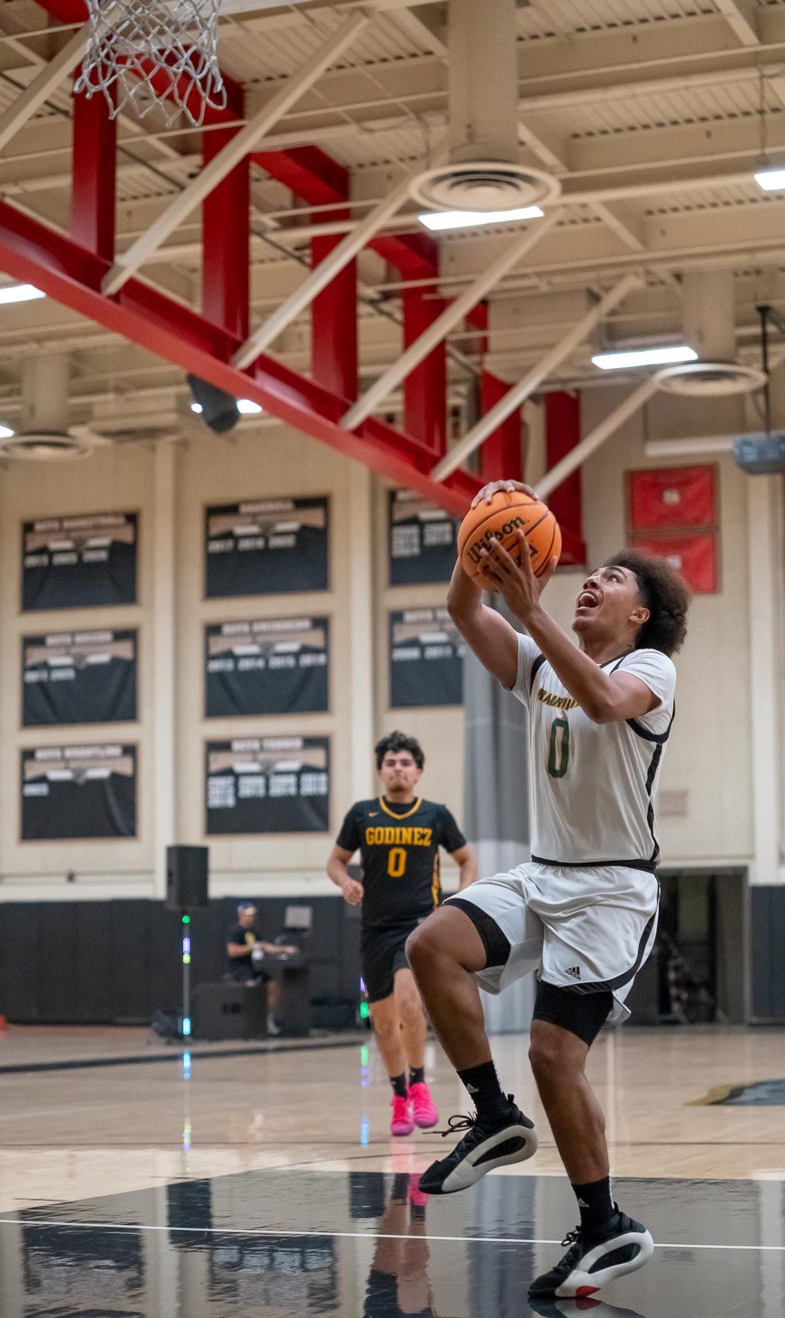 Jaiden Torres of Godinez sank a 3-pointer at the buzzer in overtime to lift the Away team to a 52-51 victory over the Home team in front of an estimated 500 fans. Torres, the MVP of the game, was mobbed by his teammates after the win after scoring 15 points in the annual game.