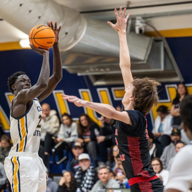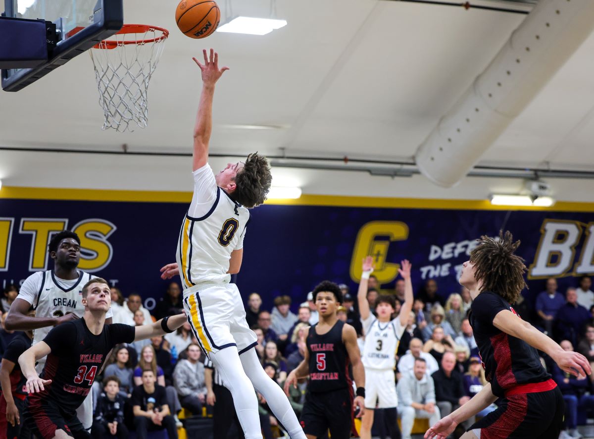 Crean Lutheran’s Hunter Caplan shoots over Myles Mobley of Village Christian Tuesday night. (Photos courtesy Crean Lutheran Shutterbugs, John Luciano, Ted Rigoni and Howard Lyon).