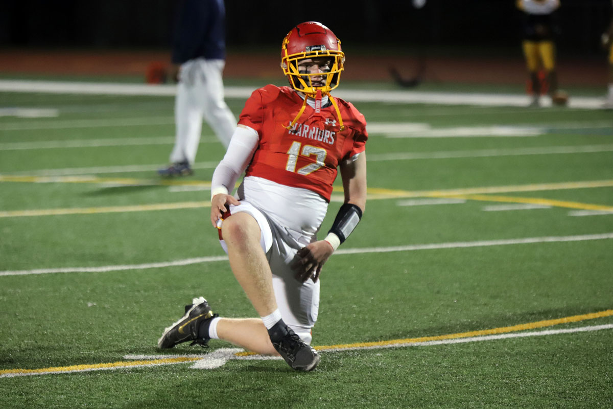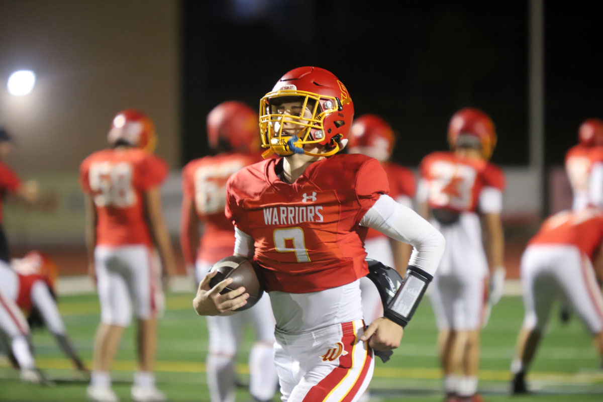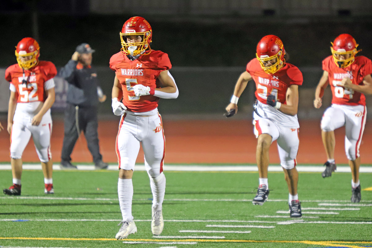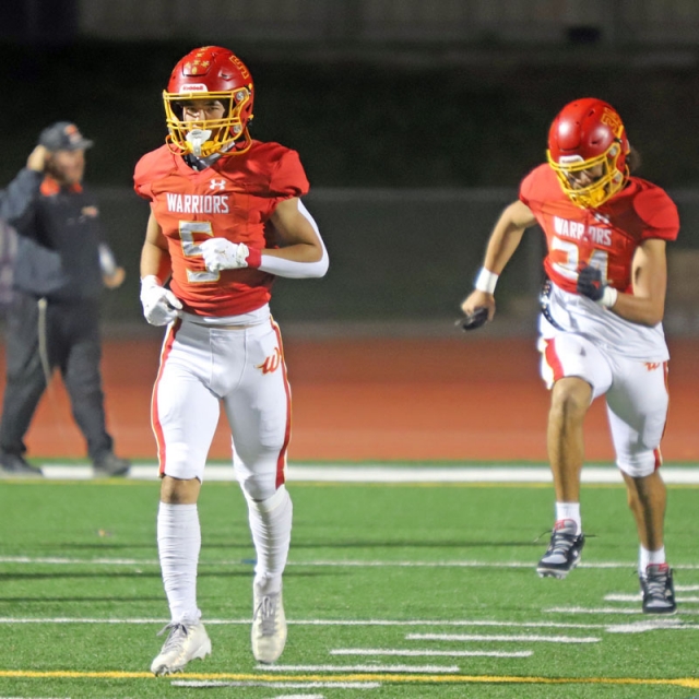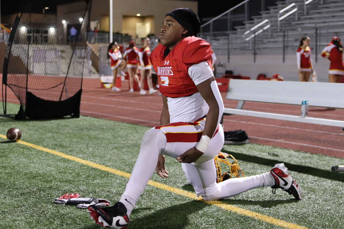 Woodbridge Coach Connor McBride and the Warriors go through warmups before Friday night’s CIF Division 13 playoff game against Desert Hot Springs at University. (PHOTOS: Fernando M. Donado, For OC Sports Zone).