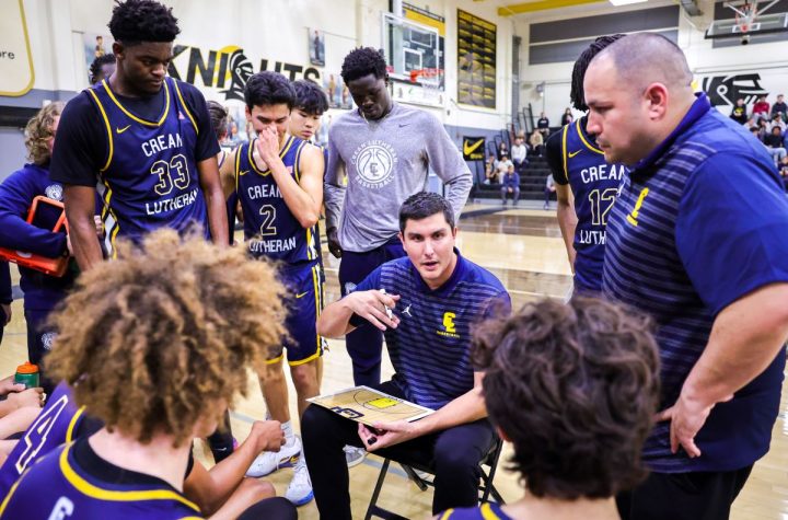 Crean Lutheran head coach Austin Loeb talks with his team during a timeout Tuesday...