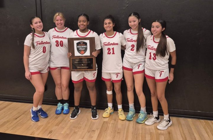 Fullerton players (from left) Jaydyn Tovar, Savanna Douglas, Mahlia Jordan, Bella Ploessel, Kathy Kakimoto...